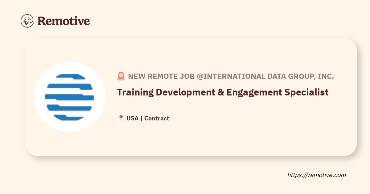 अंतर्राष्ट्रीय डेटा कॉर्पोरेशन (IDC) एक गतिशील और मांग रहा है प्रशिक्षण विकास और सगाई विशेषज्ञ (ठेकेदार) स्केलेबल व्यवसाय-विशिष्ट प्रशिक्षण और विकास कार्यक्रमों को डिजाइन, समन्वय और सुविधाजनक बनाने के लिए। यह भूमिका प्रशिक्षण सामग्री के एक भंडार के निर्माण में महत्वपूर्ण भूमिका निभाती है जो आईडीसी के अनुसंधान और डेटा संगठन में निरंतरता, स्केलेबिलिटी और डिलीवरी के मानकीकरण को बढ़ावा देती है।