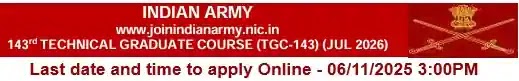 उपयुक्त और वांछनीय उम्मीदवार भारतीय सेना भर्ती वेबसाइट पर निर्धारित प्रारूप में ऑनलाइन आवेदन करते हैंhttps://join Indianarmy.nic.in केवल … से 08/10/2025 से 06/11/2025 तक भारतीय सेना के लिए इंजीनियरों के लिए 143 तकनीकी स्नातक टीजीसी प्रवेश पाठ्यक्रम।