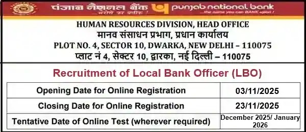 उपयुक्त और वांछनीय उम्मीदवारों को आवेदन करना चाहिए निर्धारित प्रारूप में ऑनलाइनकेवल पंजाब नेशनल बैंक की वेबसाइट पर 03/11/2025 से23/11/2025पीएनबी में स्थानीय बैंक अधिकारी रिक्ति भर्ती 2025 के लिए.